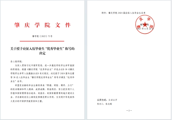 近日,学校下发《关于授予应征入伍毕业生“优秀毕业生”称号的决定》。其中,TapTap点点官方网站2020级历史学2班廖展锋、2020级酒店管理1班李健俊、2020级酒店管理1班林梓豪、2020级旅游管理1班黄志炜等4 名入伍毕业生被授予“肇庆学院优秀毕业生”称号并颁发“优秀毕业生”证书。