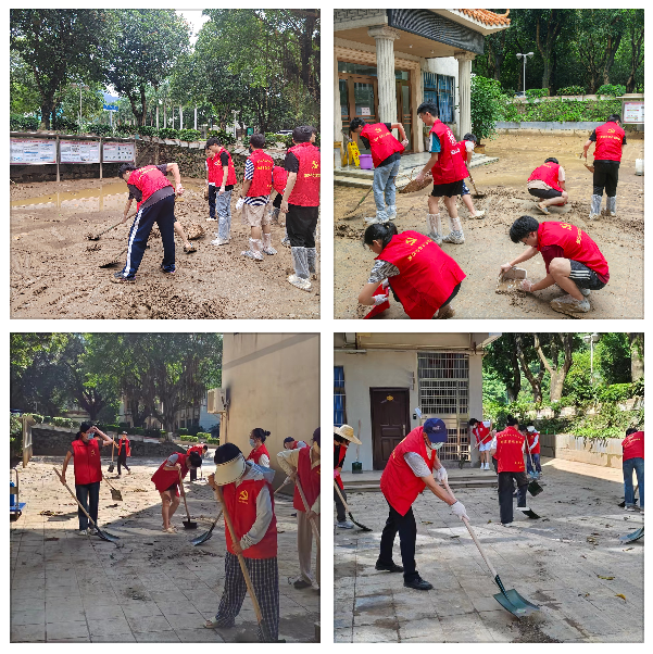 高温炙烤下,学院前后的小广场淤泥堆积、杂物散落。志愿者们汗水浸透衣背、泥点溅满脸颊,但大家毫不犹豫,手持铁铲,在泥泞中穿梭忙碌。经过努力,淤泥被有条不紊地清除,校园环境得到了显著的改善。