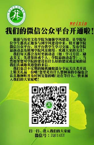 为了加强学风建设,及时反映和解决学生在学习、生活和工作中遇到的问题,旅游与历史文化学院充分发挥现代信息技术在加强学风建设中的作用,在已有QQ群、飞信、微博等基础上率先开通学院微信公众平台,让学院每位同学都真正地参与到学风建设中来。