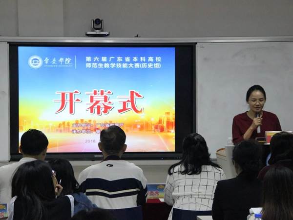 开幕式伊始,杨雪梅书记代表承办方向参加比赛的九所高校领导、指导老师以及参赛选手表示热烈的欢迎,并介绍了肇庆学院的办学历史、办学理念以及历史学科的专业特色。她指出,举办历史师范生教学技能大赛,不仅有利于加强历史师范生教学技能的提高和拓展学术视野,同时也有利于广大师生更好的跟踪教学前沿,实现理论与实践的对接,对历史学科和师范教育的发展而言都是大有裨益的。最后,希望选手们赛出水平、赛出风格、赛出成绩。