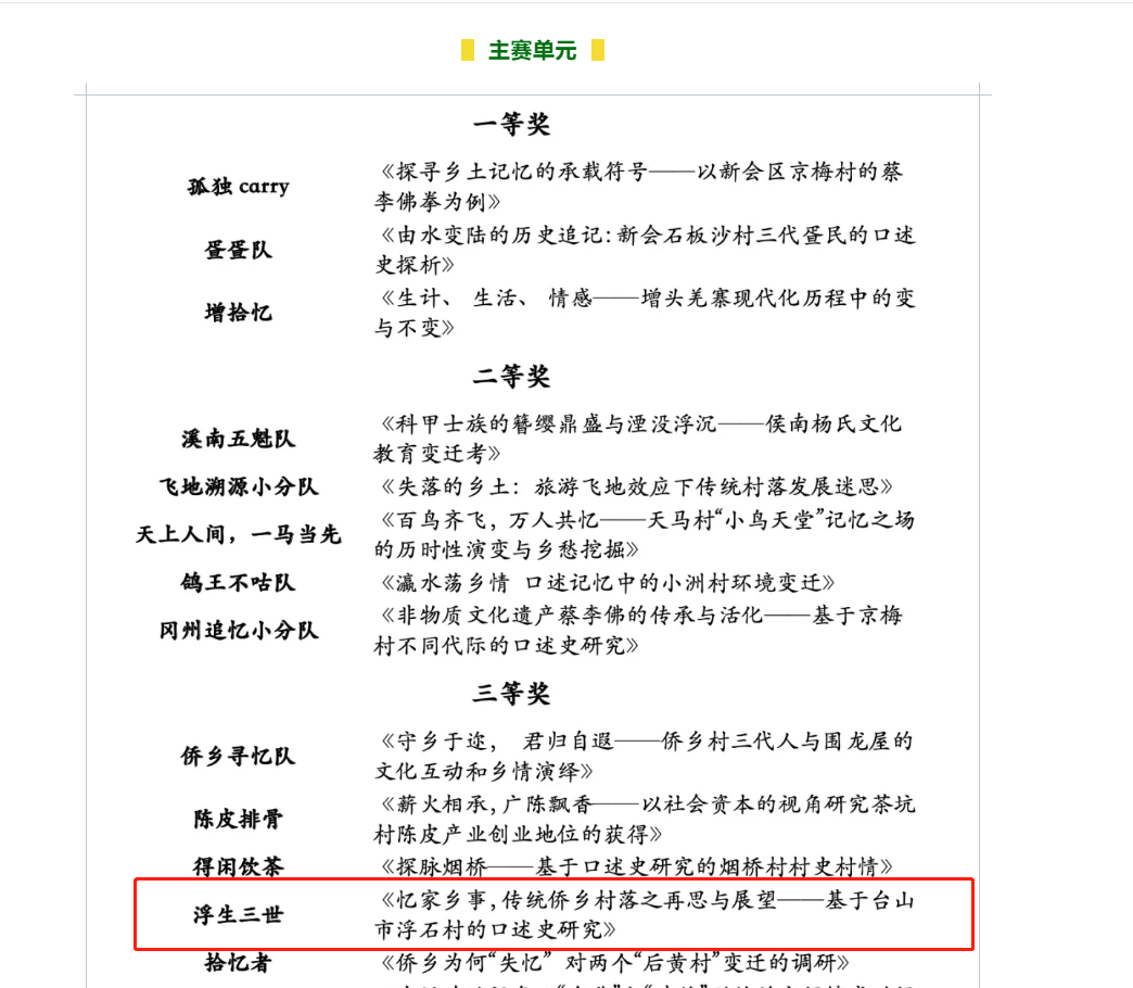 近日,由中山大学TapTap点点官方网站、共青团广东省委员会青年发展部和广东省江门市新会区文化广电旅游体育局联合主办,中山大学旅游休闲与社会发展研究中心负责承办的第五届全国大学生“发现传统村落”调研大赛结果公布,TapTap点点官方网站由谢杲馥博士指导,历史系18级学生朱伟杰、谭智远的作品《忆家乡事,传统侨乡村落之再思与展望——基于台上市浮石村的口述史研究》获得主赛单元三等奖的好成绩。