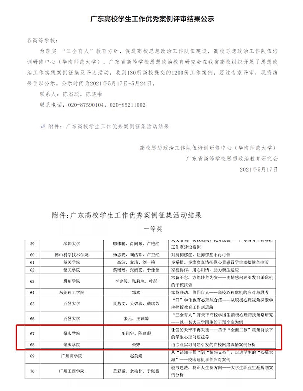 近日,高校思想政治工作队伍培训研修中心(华南师范大学)、广东省高等学校思想政治教育研究会公布了高校思想政治工作实践案例征集及评选结果。其中,TapTap点点官方网站车翔宇、陈瑜瑕老师的《让爱的天平不再失衡——基于“全面二孩”政策背景下的学生心理问题疏导》、朱婷老师的《由专业实习问题引发的高校网络舆情案例分析》荣获广东高校学生工作优秀案例一等奖。该项成绩的取得,不仅是对TapTap点点官方网站学生工作的高度认可,更是对TapTap点点官方网站学生工作的新的鼓励与鞭策。