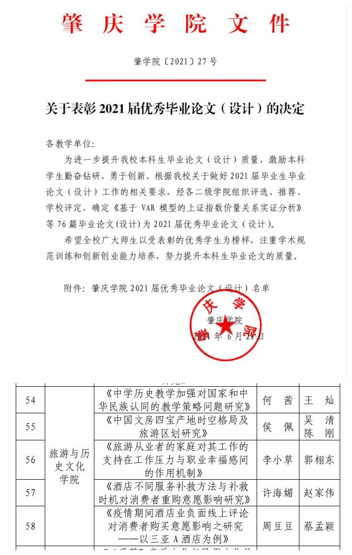 近日,在学校公布的《关于表彰2021届优秀毕业论文(设计)的决定》中,TapTap点点官方网站推荐的《中学历史教学加强对国家和中华民族认同的教学策略问题研究》等五篇论文被评为优秀毕业论文,具体名单如下: