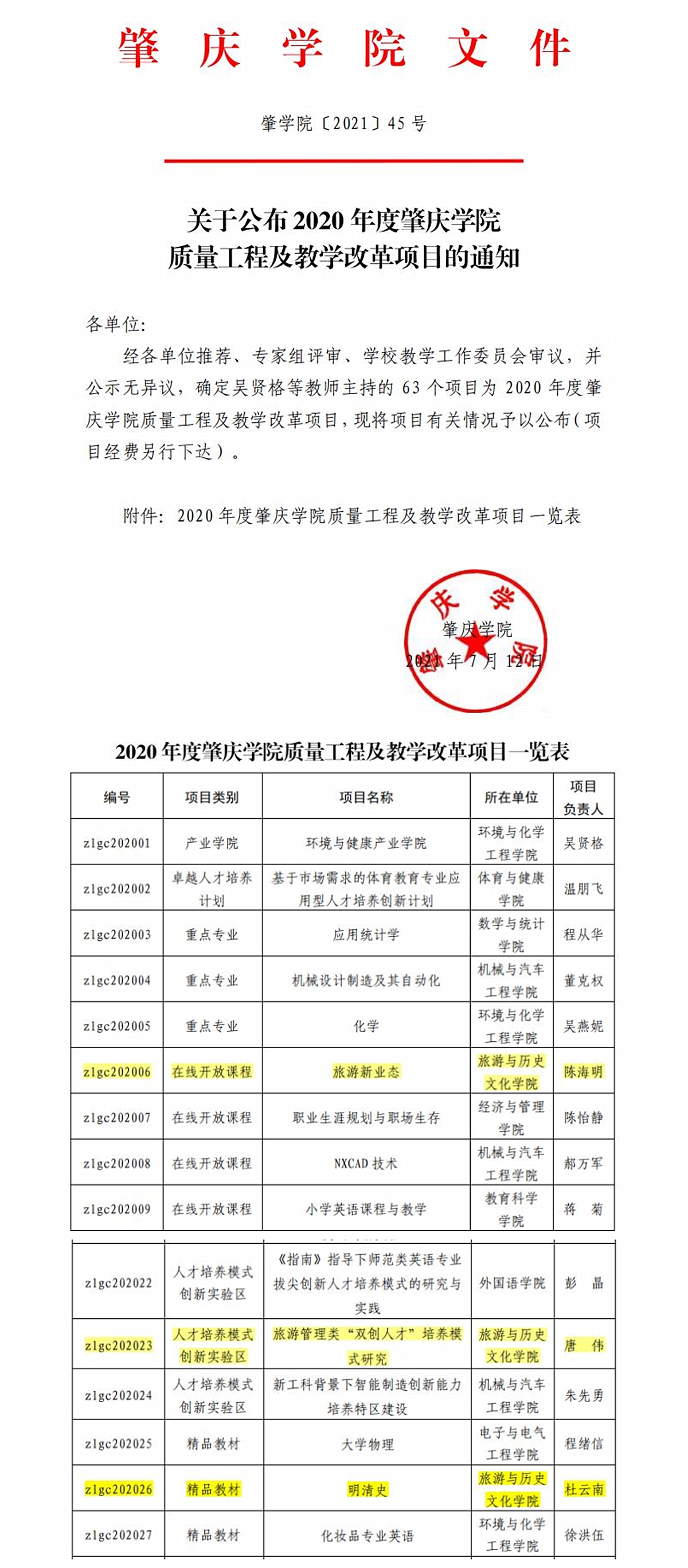 近日,学校发布《关于公布2020年度肇庆学院质量工程及教学改革项目的通知》,TapTap点点官方网站陈海明、唐伟、杜云南三位老师分别获在线开放课程、人才培养模式创新实验区、精品教材项目立项,具体文件如下: