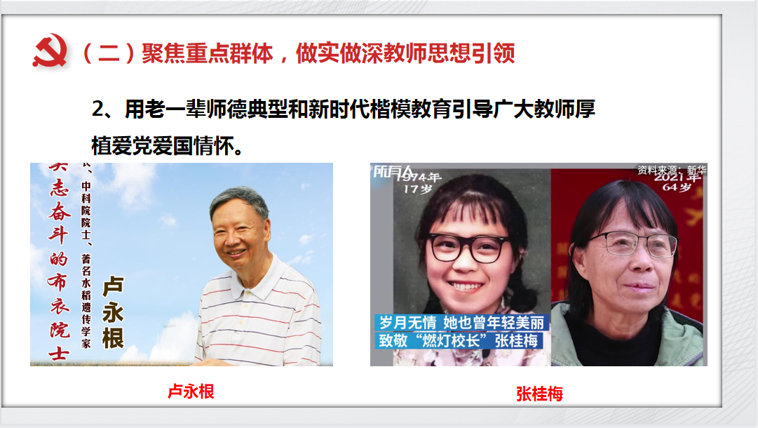 老师们表示,通过专题学习,从陈独秀、李大钊、徐特立等革命先驱的红色故事,从霍懋征、黄大年、卢永根、钟南山、张桂梅等时代楷模的先进事迹中,要学先进、做先进,争当师德楷模;要捍卫职业尊严,珍惜教师声誉,提升师德境界;要落实立德树人根本任务,弘扬新时代教师道德风尚,争做有理想信念、有道德情操、有扎实学识、有仁爱之心的“四有”好老师,在教书育人的岗位上为党和人民的教育事业作出新的更大的贡献。