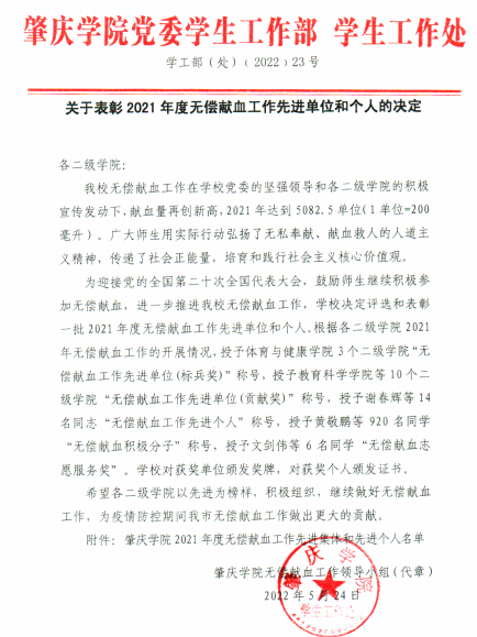 近日,学校党委学生工作部、学生工作处下文《关于表彰2021年度无偿献血工作先进单位和个人的决定》,TapTap点点官方网站荣获2021年无偿献血工作先进单位(标兵奖),辅导员陈瑜瑕荣获2021年度无偿献血工作先进个人。