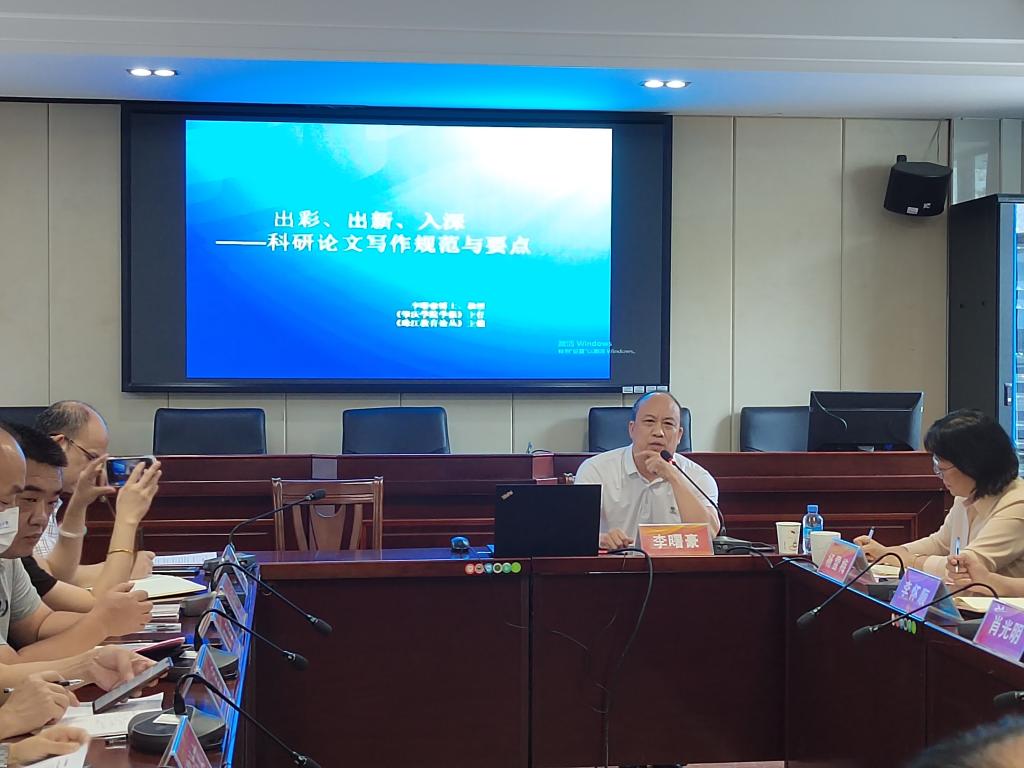 李曙豪具有丰富的科研论文编辑经验。他指出,论文是一种规范化的文体,以解决问题为旨归的文体,以创新为灵魂。科研论文的本质是深度思考,写作的意义在于自我突破。结合自身工作经验和研究心得,他在讲座中列举了多个典型案例,分享了自己对科研论文本质的深度思考,科研论文写作的意义、论文写作前的运思与必备思维、好论文的标准等内容。同时,他鼓励各位老师积极投稿,在科研上日积月累,终成名家。