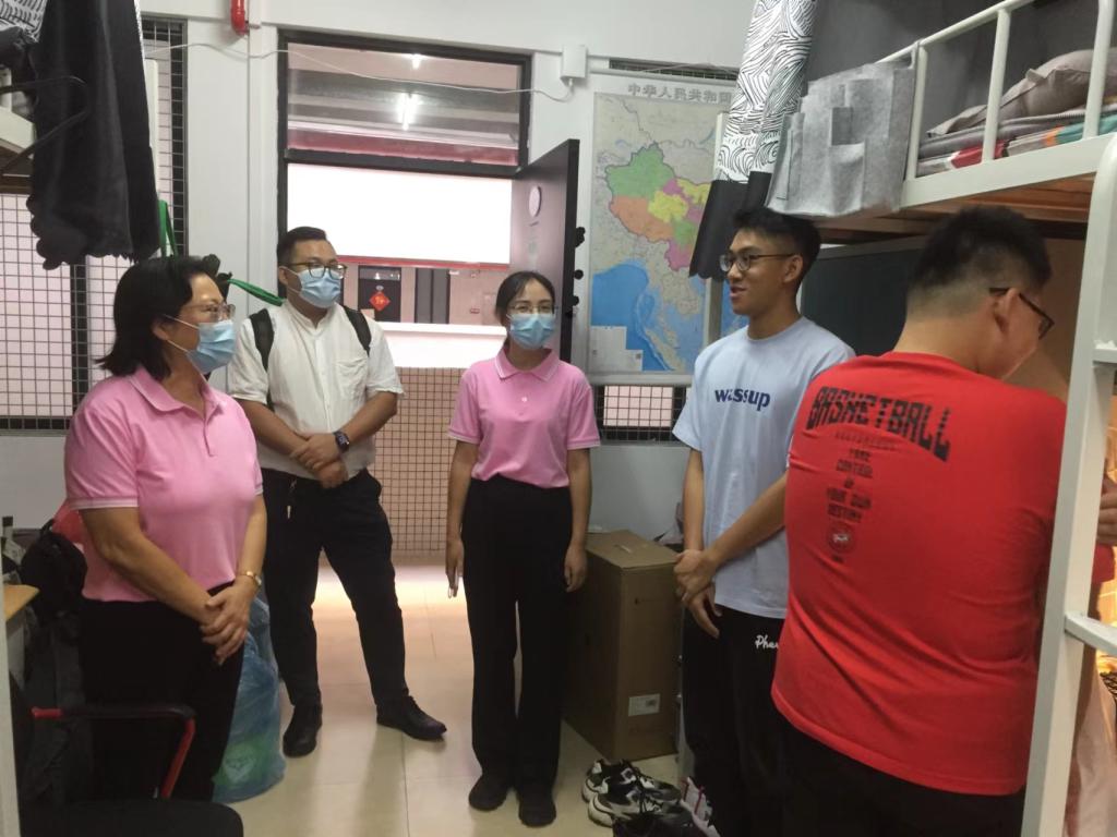 走访过程中,老师们与同学们亲切交谈,详细了解大家在国庆假期的活动安排以及出行情况,掌握同学们的思想动态,提醒同学们一定要严格遵守学校的有关规定,所有跨地市出行的同学和有低风险区旅居史同学必须凭24小时核酸检测阴性证明才能返校并及时完成核酸三天两检。同时,要求同学们严格遵守学校疫情防控各项管理规定,关注身体状况,如实做好每日健康打卡;注意宿舍卫生,勤洗手、多通风、戴口罩、少聚集;做到非必要不离校,若请假离校,要严格执行请假及报备手续。此外,老师们还对同学们的学习生活提出建议,提醒大家秋干物燥要谨防火灾;务必提高宿舍用电安全意识、防止诈骗,合理安排作息时间,适当进行户外运动,以良好的身心状态迎接新的学习任务。