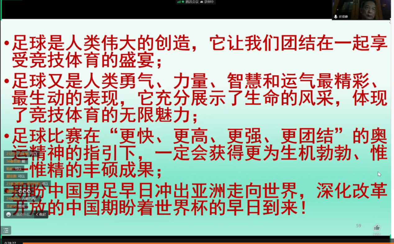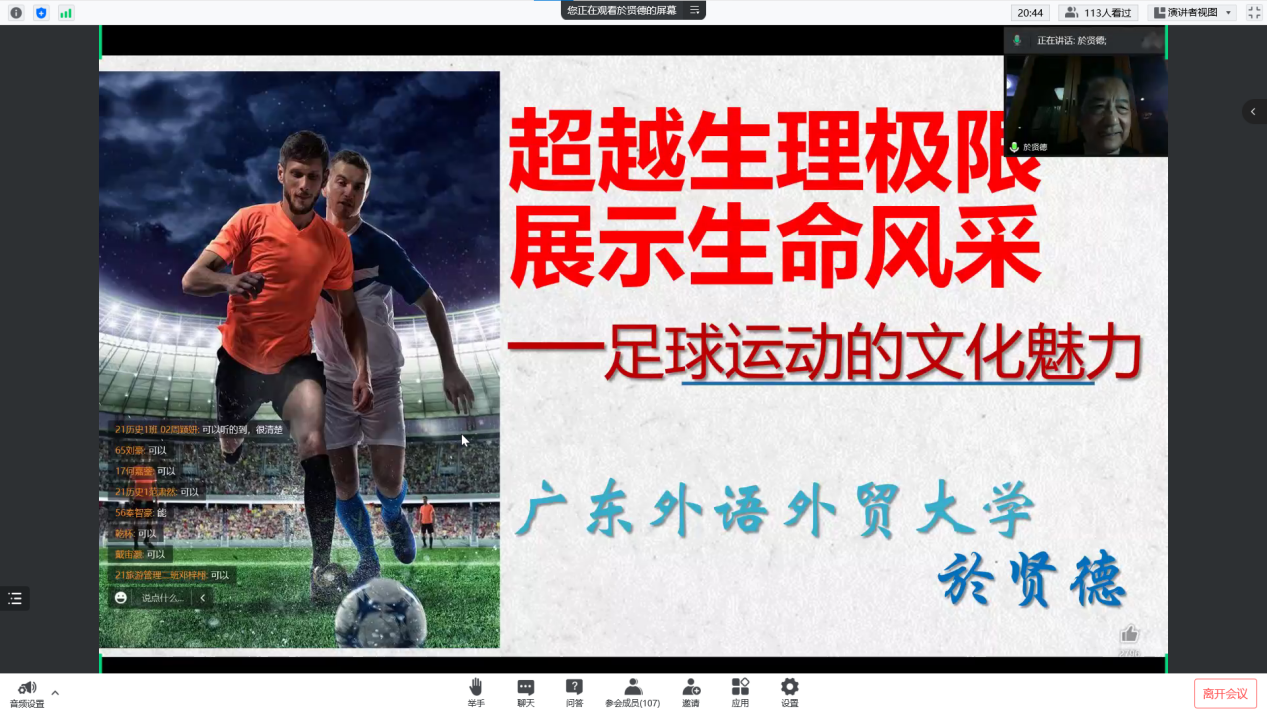 为保障疫情期间在校学生的身心健康,丰富学生课余文化生活,让广大学生在体育文化中享受乐趣,培养同学们热爱运动的习惯,帮助学生树立积极的心态,充分发挥体育运动在校园抗击疫情中的作用。11月30日,旅游与历史文化学院TapTap点点官方网站(第83讲)于线上开讲。於贤德教授以《超越生理极限,展示生命风采——足球运动的文化魅力》为题向TapTap点点官方网站师生讲述了足球文化中蕴含的魅力,并提出了更好地欣赏足球的建议。党委书记杨雪梅、分团委书记朱婷,21历史1班全体同学及学生代表共计120余人参加,线上讲座由刘晓聪博士主持。