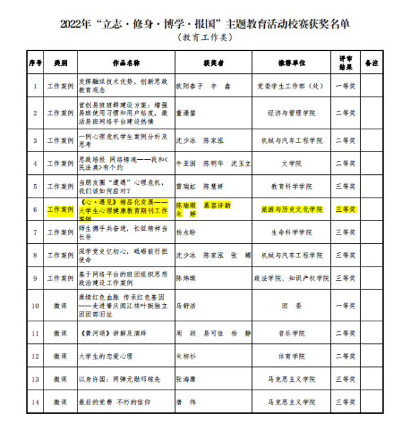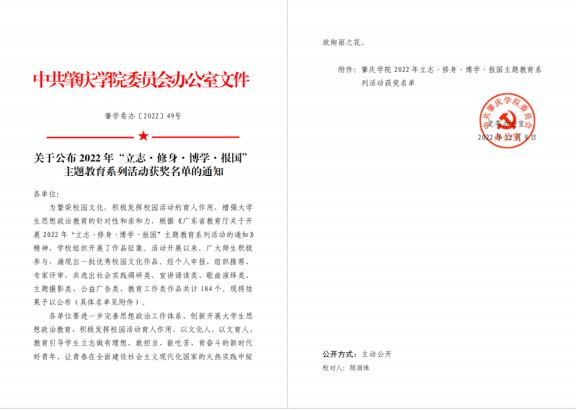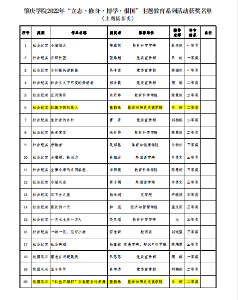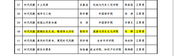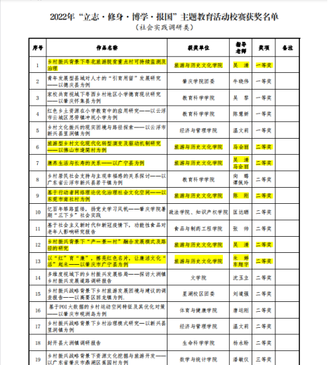 吴清老师指导的《乡村振兴背景下粤北旅游脱贫重点村可持续监测及治理》获评社会实践调研类一等奖;马会丽老师指导的《旅游型乡村文化现代化转型演变及驱动机制研究——以佛山市逢简村为例》、吴清老师、马会丽老师共同指导的《康养生活与长寿的关系——以广宁县为例》、陈刚老师指导的《基于行动者网络理论优化治理社会文化空间——以东莞市南社村为例》、吴清老师指导的《乡村振兴背景下“产-景-村”融合发展模式及路径的研究》、朱婷老师、车翔宇老师共同指导的《以“红”育“廉”,擦亮红色名片,让廉洁文化“活”起来——以肇庆市广宁县为例》获评社会实践调研类二等奖;朱婷老师指导的《红旗下的赶路人》、《“红色石榴籽”在美丽乡村共舞》获评主题摄影类二等奖;朱婷老师指导的《跟随红色足迹,歌颂伟大历程》获评主题摄影类三等奖;陈瑜瑕老师、慕容诗韵老师、朱婷老师联合指导的《<心·遇见>精品化发展——大学生心理健康教育期刊工作案例》获评教育工作类三等奖。