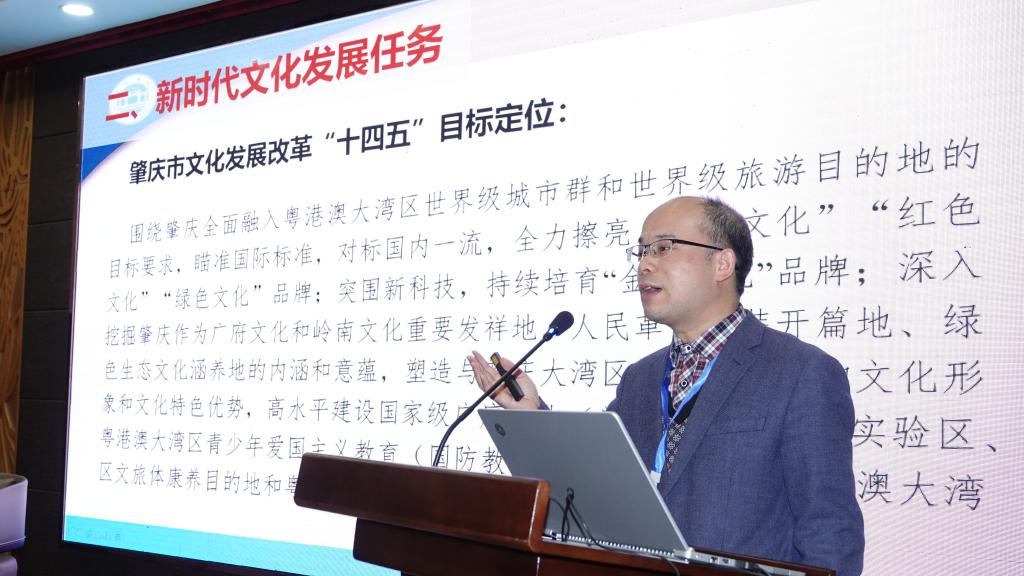 李朝军院长作题为“申创广府文化生态保护实验区:理论思考和工作路径”的主旨报告。分析了肇庆广府文化和肇庆申创广府文化生态保护实验区的优势条件,从指标体系、基本思路、任务分解三方面阐释了申创的主要内容,剖析了申创省级文化生态保护实验区和国家级生态文化保护实验区的工作路径。他认为,广信文化、端砚文化、铁军文化、利玛窦文化、龙母文化是我们肇庆地区具有唯一性和世界影响力的历史文化资源,是肇庆实现从文化资源高地转化为文化产业和事业高地的根本依托。