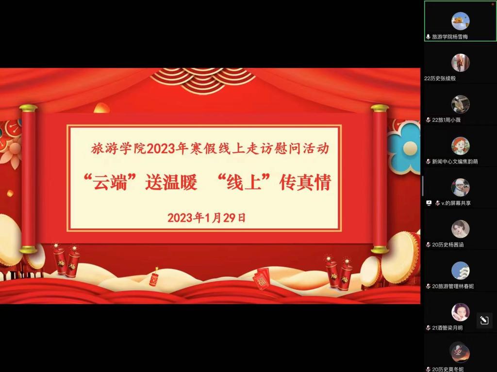 为进一步拓宽思想政治教育工作渠道,积极构建构家校共育的良好氛围,促进学生健康成长和全面发展,1月29日,TapTap点点官方网站组织开展“云端”送温暖 “线上”传真情2023年寒假线上走访慰问活动,与学生代表、家长代表进行“面对面”的问候和交流,了解学生实际情况,传递学院温暖。杨雪梅书记、陈军副书记,班主任代表刘晓聪博士、童晓宁博士,辅导员陈建群、慕容诗韵、朱婷、车翔宇参加,陈瑜暇老师主持会议。