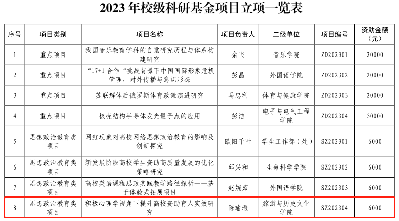1、陈瑜瑕:《积极心理学视角下提升高校资助育人实效研究》(思想政治教育类项目)