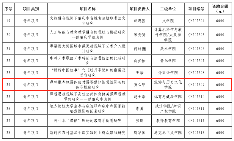 2、黄心甲:《森林康养旅游体验对游客感知恢复性影响的传导机制研究》(青年项目)