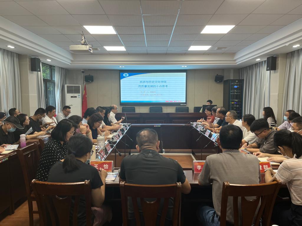 李朝军院长结合主题教育学习成果,作题为《旅游与历史文化学院高质量发展的思考》专题发言。他从快速适应从省市共建到省属体制的转变、谋划新校区建设学院事业发展的新布局、完成好从专业建设到学科建设引领转变、适应从本科教育到本研一体培养的转变、完成从教学型向教学研究型学院的转变、完成从单纯传授知识到立德树人的转变、完成数量到质量、个人到团队导向转变、完成内向型向外向型全面开放办学转变、完成粗放管理到科学管理现代治理转向、完成制度刚性到文化浸润学院文化转变等十个方面对学院未来的高质量发展提出思考。