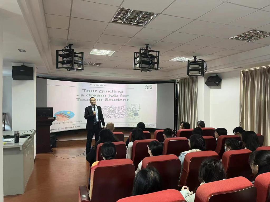 本次讲座, Rafal Dymczyk教授从国际视角对“导游”这个职业进行了专业性的分析和介绍,给同学们讲解了目前国际导游业务相关方面的知识。 Rafal Dymczyk教授语言生动活泼,风趣幽默,同学们积极回应,互动频繁,现场气氛良好,纷纷表示受益良多。