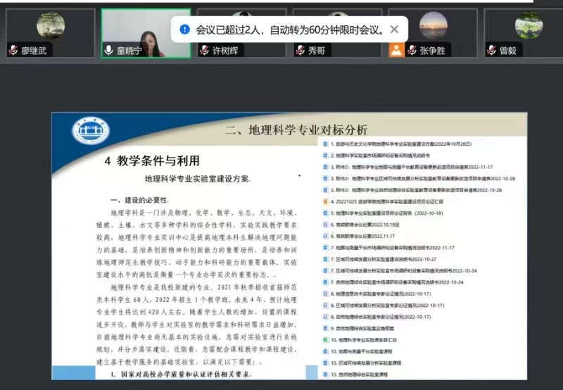 近日,旅游与历史文化学院举行地理科学专业新增学士学位授予工作专家论证会。华南师大张争胜教授、岭南师院尚志海教授、韶关学院许树辉教授、肇庆市教育局吴毓秀教研员、TapTap点点官方网站教学督导与评估中心曾毅教授等五位校内外专家,旅游学院副院长廖继武、地理科学系主任童晓宁以及地理科学系骨干教师通过线上线下相结合的方式共同参加。