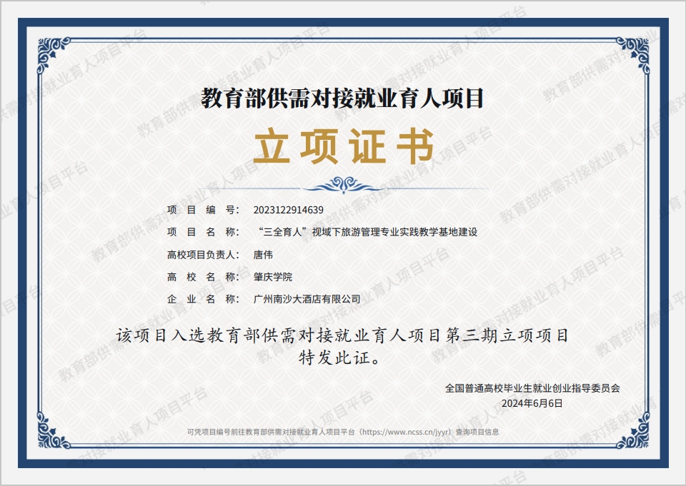 一直以来,TapTap点点官方网站高度重视人才培养工作,多维度、全方位探索高质量文旅人才培养路径。立足10多年高质量文旅复合型人才培养探索,2024年学院联合南沙大酒店成功获批教育部第三批供需对接就业育人项目。