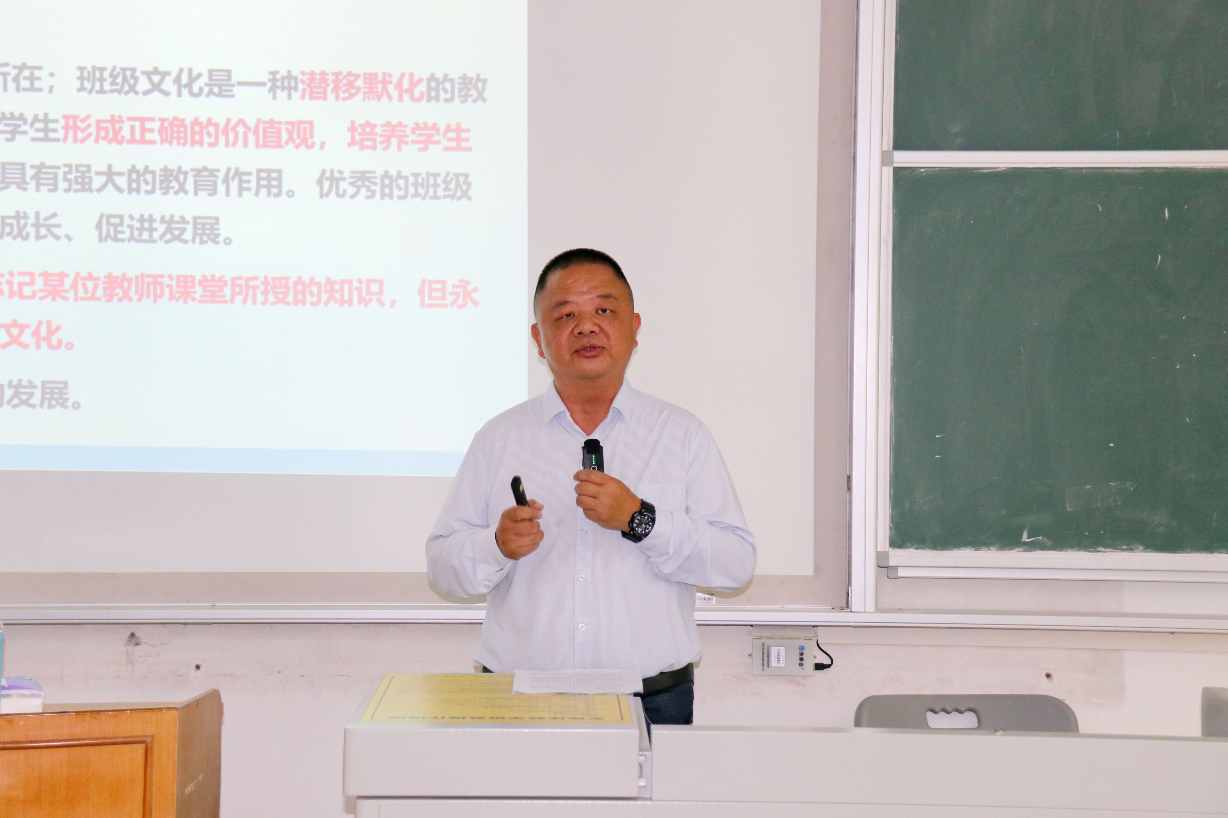 陶兴永老师围绕班级文化的含义、功能和建设三方面内容展开讲座。他指出了优秀班级文化具有教育、规范和凝聚的功能,并结合自己从教多年的经验,深入浅出为同学们耐心讲解。他提出优秀班级文化的打造应当从四个维度入手,即“精神文化”“物质文化”“制度文化”“行为文化”,要让班级“精神”引领群体“行为”,让“物质”和“制度”为群体行为保驾护航。