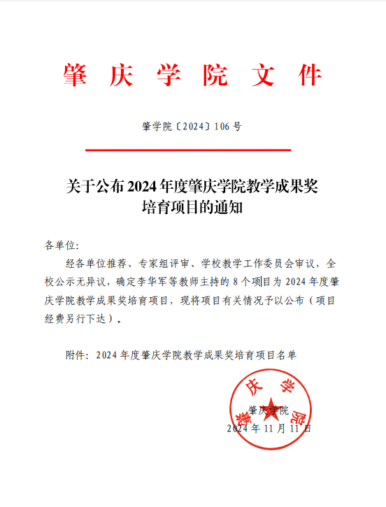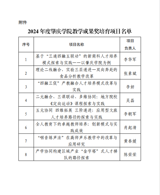 近日,学校公布了2024年度肇庆学院教学成果奖培育项目名单,TapTap点点官方网站李朝军院长主持的《五元协同 四维拓展 三阶递进:应用型文旅人才培养路径的探索与实践》项目获评2024 年度肇庆学院教学成果奖培育项目。