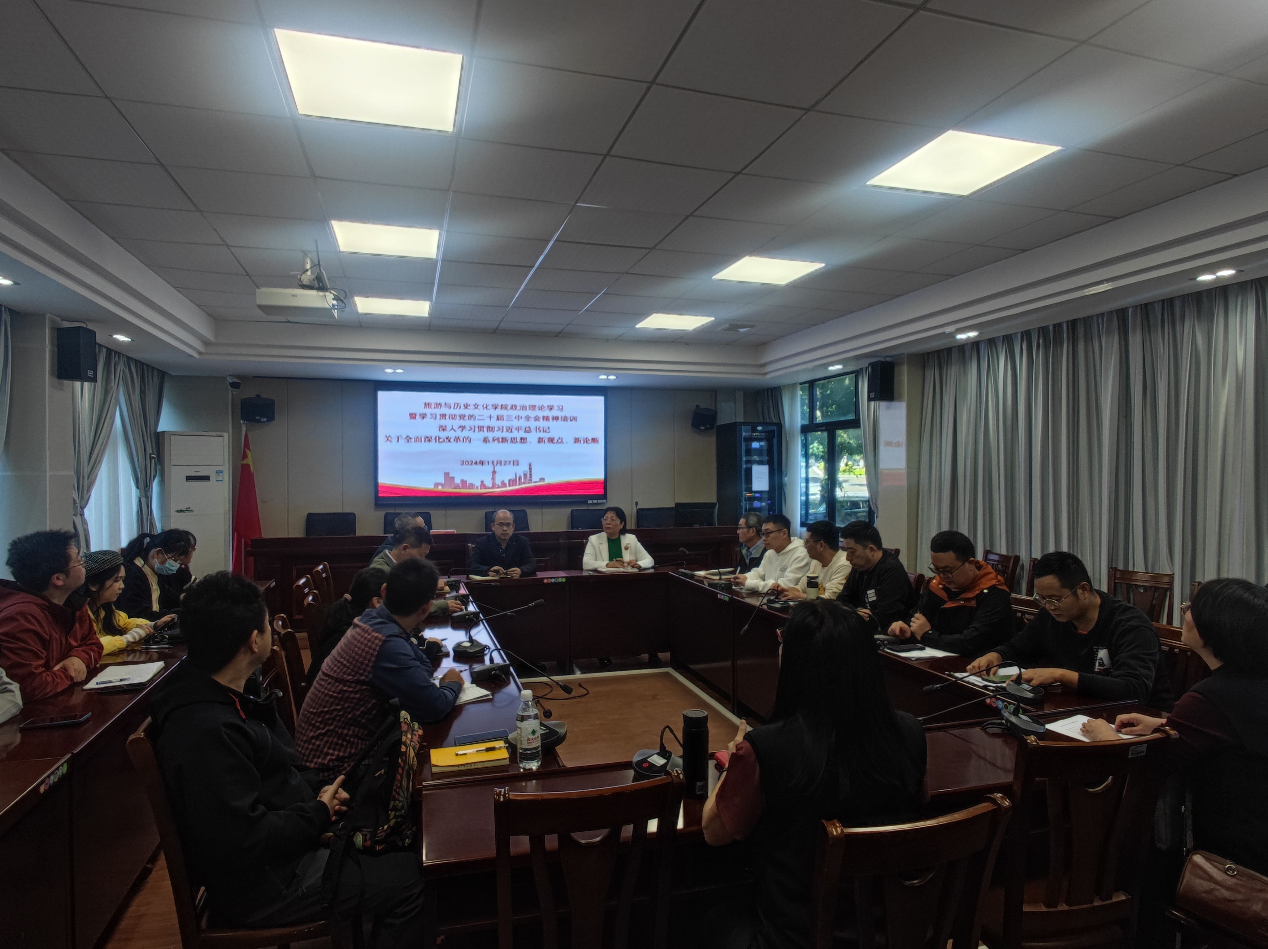 11月27日下午,旅游与历史文化学院举办政治理论学习暨学习贯彻党的二十届三中全会精神培训,党委书记杨雪梅主持,李朝军院长、郑安徽副书记、廖继武副院长、科级及以下干部和其他党员参加。
