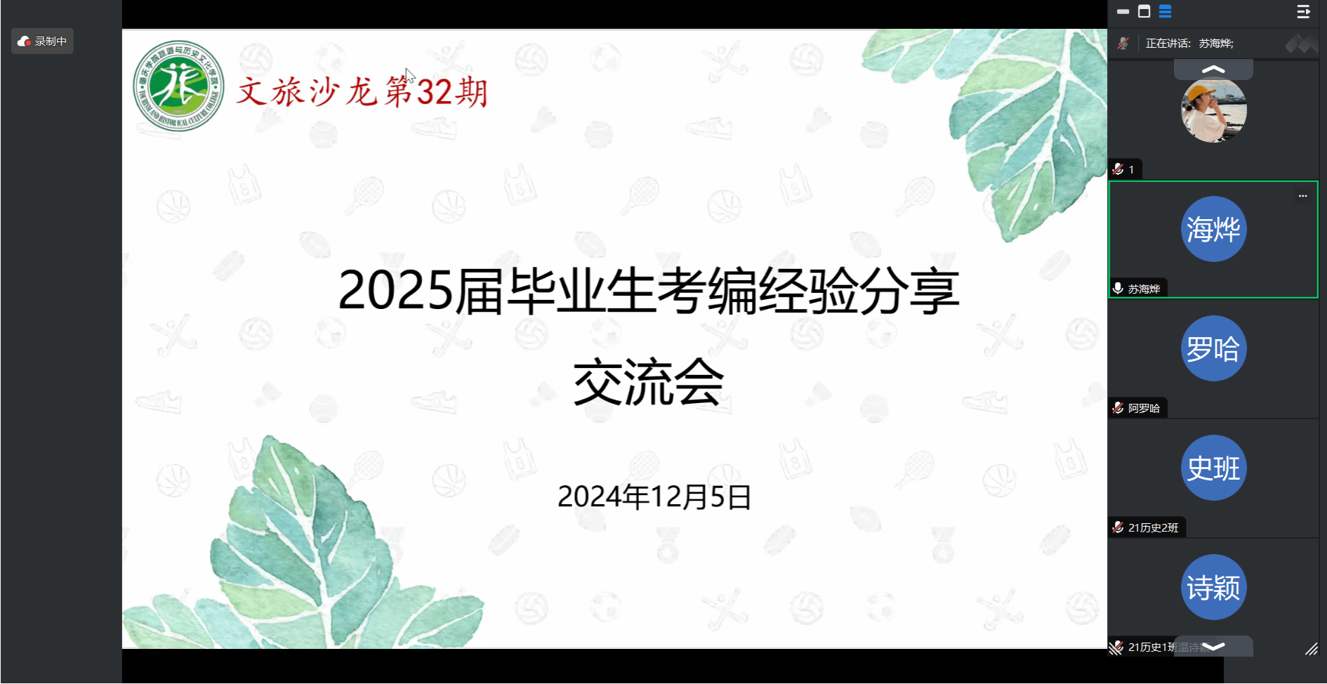 本次交流会有幸邀请到24届苏海烨校友分享她的考编经验,她先从自身考编经历出发,围绕笔试和面试备考技巧及策略、岗位选择、心态调整等多个方面展开深入分享,同时还深入分析了考编过程中的重点、难点,提醒同学们在备考准备过程中可能会出现的误区。最后鼓励大家不要怕碰壁和失败,及时进行经验总结,多尝试多接触;不要过分焦虑,相信自己。