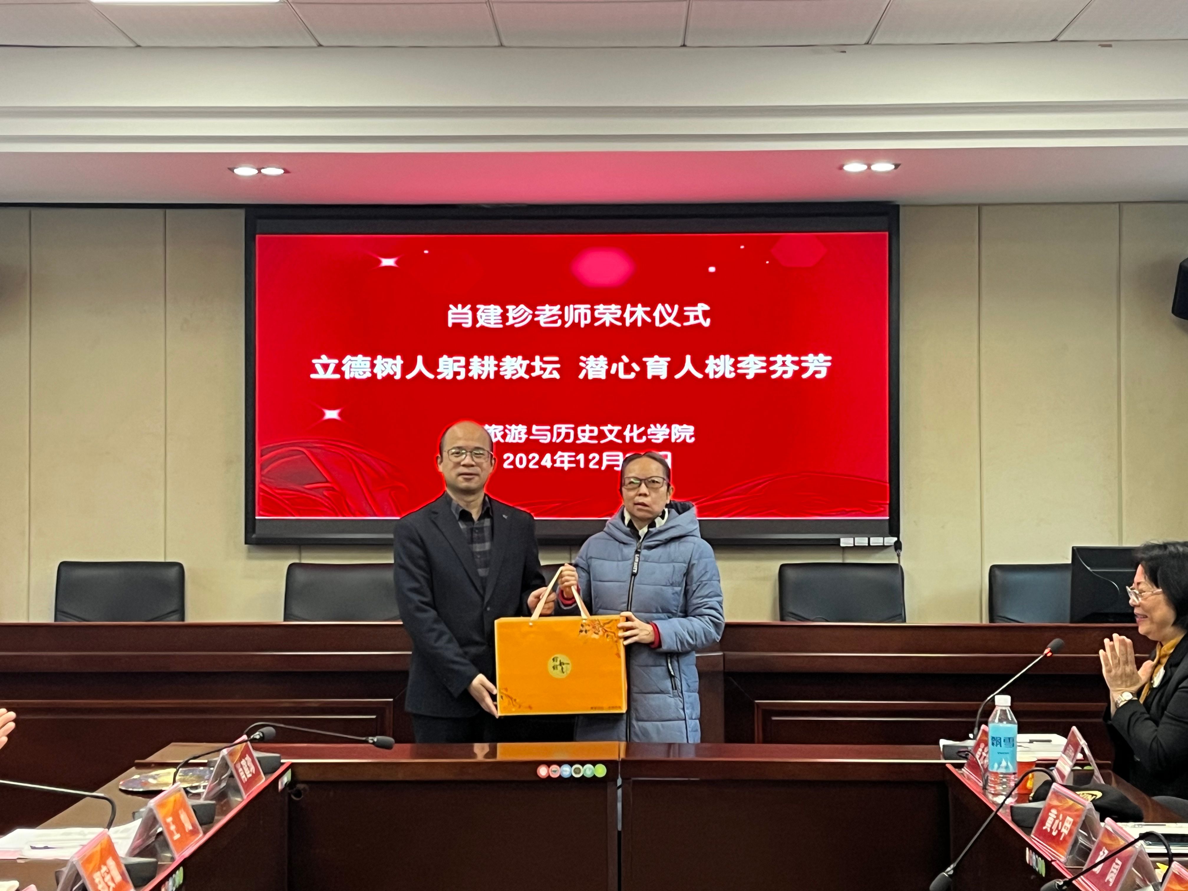 李朝军院长代表学院向肖建珍老师致以诚挚的感谢和崇高的敬意。他表示,荣休教师既是学院事业发展的建设者,又是学院创业历史的见证者,是学院无形和无价的宝贵财富。学校和学院事业的每一次发展与进步,取得的每一份荣誉与成绩,凝聚着一代又一代砚园人和旅院人的心血与智慧,都离不开荣休教工潜心教学科研,倾心管理服务,接续服务和无私奉献。对教师来说,荣休是对过去从教生涯的总结和肯定,也是教师事业发展值得骄傲的时刻。对学院来讲,荣休教师将青春和智慧留在了学院,为人才培养、教学科研和学院事业发展做出了独特而重要的贡献。他希望肖老师继续发挥爱院荣院的热情,退休不褪色,一如既往地关心支持学院事业发展。他还勉励青年教师要传承发扬荣休教师的优良传统,承其志、宏其愿,立志做教书育人的“大先生”,做润己泽人的“好老师”,接续奋斗、勇毅前行。