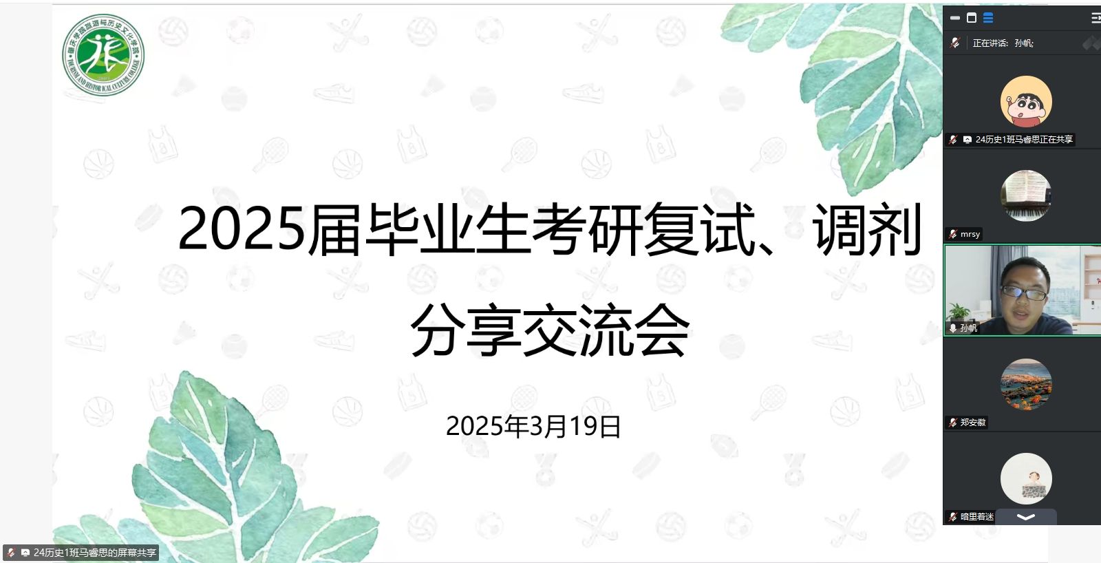 为进一步加强考研学生复试与调剂的分类指导,帮助其明确方向、掌握技巧,提高2025届毕业生考研录取率,3月18日晚,TapTap点点官方网站线上举行2025届毕业生年考研复试与调剂交流会。学院党委郑安徽副书记、历史系副主任孙帆老师、辅导员慕容诗韵老师、25届考研学生以及24届研究生校友参加。