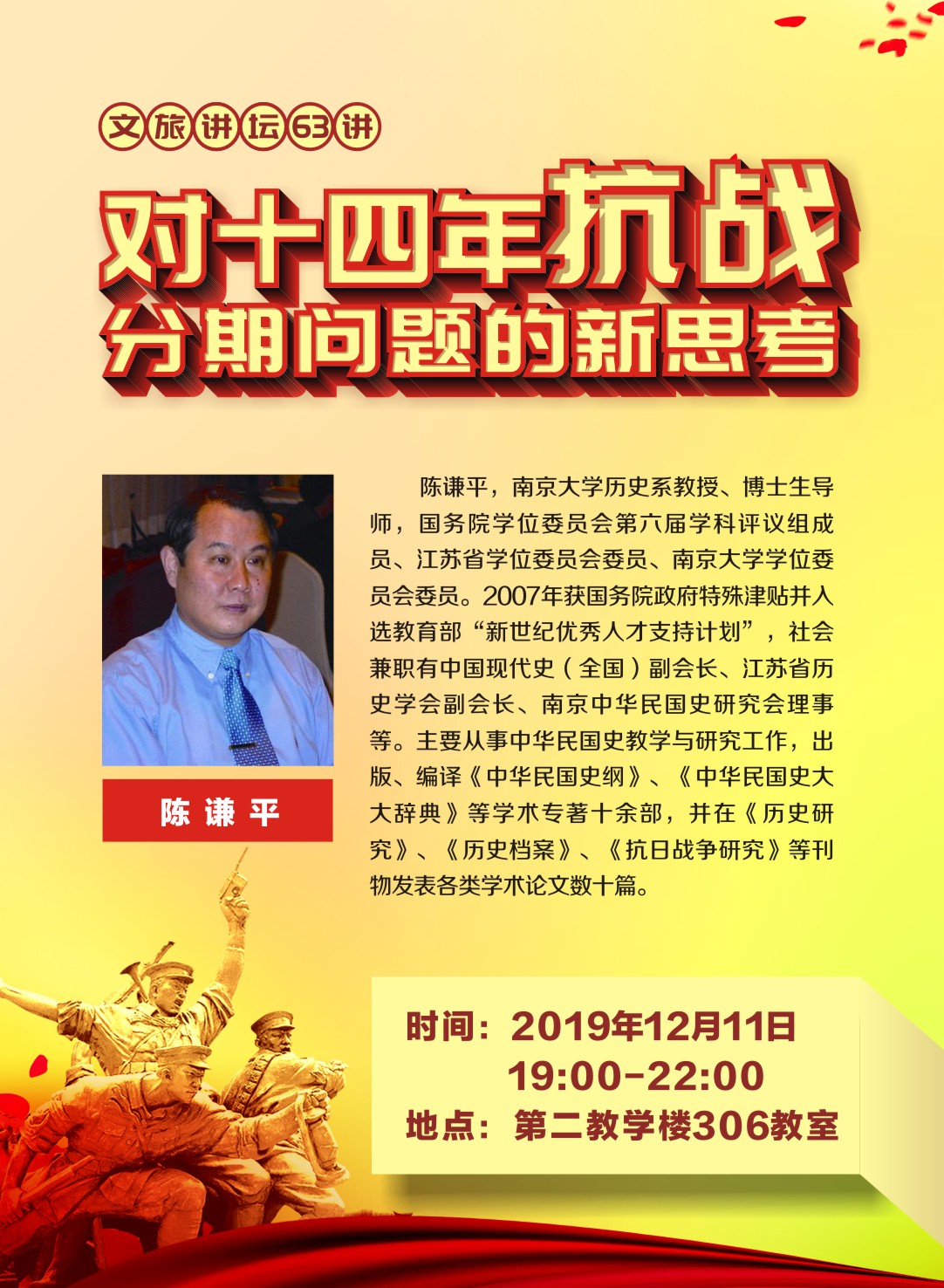 陈谦平,南京大学历史系教授、博士生导师,国务院学位委员会第六届学科评议组成员、江苏省学位委员会委员、南京大学学位委员会委员。2007年获国务院政府特殊津贴并入选教育部“新世纪优秀人才支持计划”,社会兼职有中国现代史(全国)副会长、江苏省历史学会副会长、南京中华民国史研究会理事等。主要从事中华民国史教学与研究工作,出版、编译《中华民国史纲》、《中华民国史大大辞典》等学术专著十余部,并在《历史研究》、《历史档案》、《抗日战争研究》等刊物发表各类学术论文数十篇。