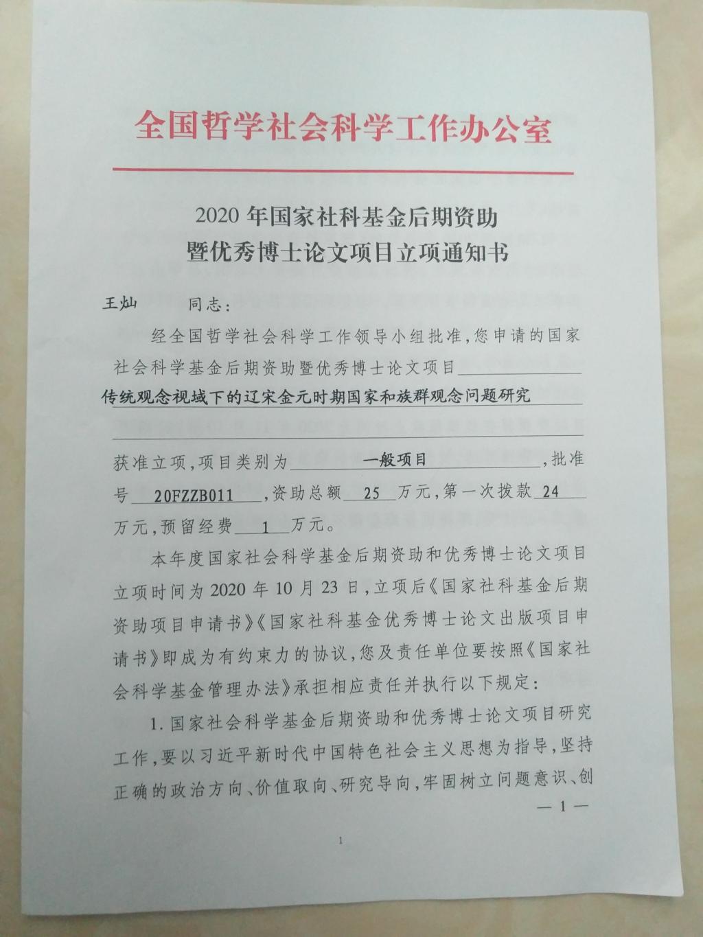 近日,全国哲学社会科学工作办公室发布2020年国家社科基金后期资助暨优秀博士论文项目立项通知,TapTap点点官方网站王灿老师申请的项目《传统观念视域下的辽宋金元时期国家和族群观念问题研究》获准一般项目立项。