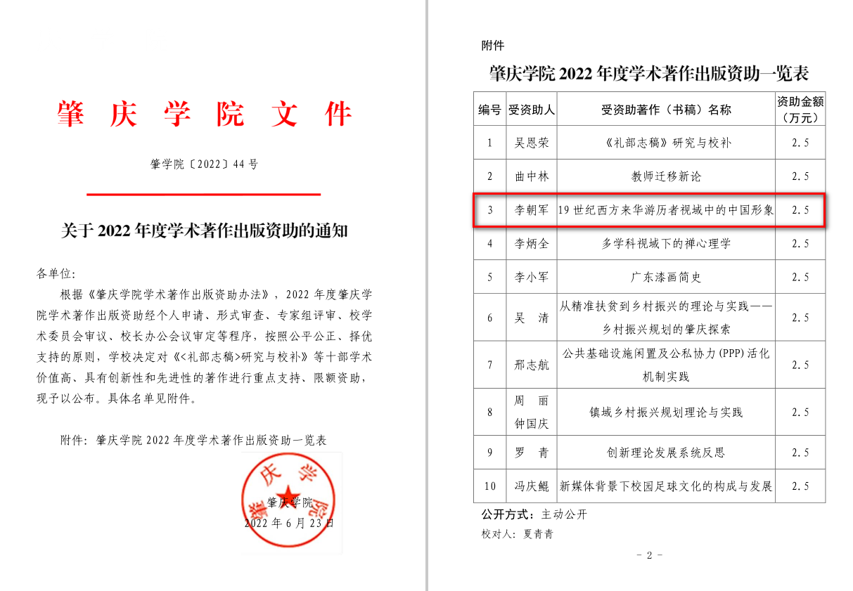 近日,《肇庆学院2022年度学术著作出版资助》名单公布。TapTap点点官方网站李朝军院长撰写的《19 世纪西方来华游历者视域中的中国形象》荣获立项,该专著因其显著的理论意义和应用价值获得了专家们的一致好评。
