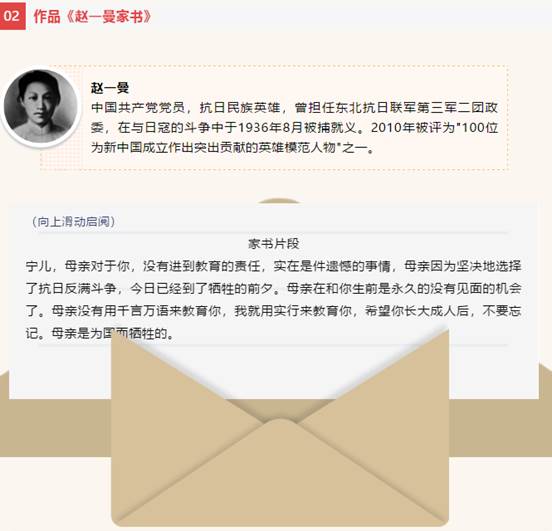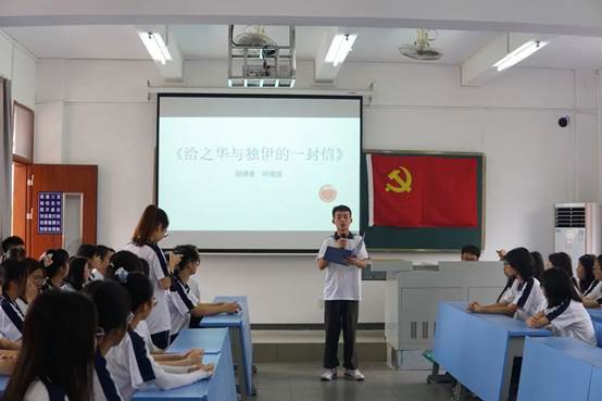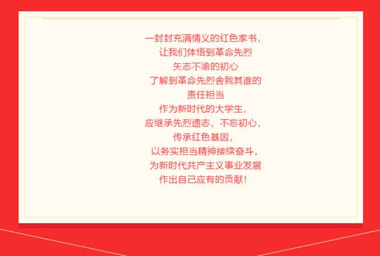 在优美的旋律中,同学们饱含深情地朗诵了一封封饱含深情的红色家书。当我们去掀开尘封的历史,去阅读烈士们留下的一封封家书时,真切感受到一个个鲜活的生命也曾热烈的绽放过,有着革命的情怀、不屈不挠的斗志、大无畏的无私精神。