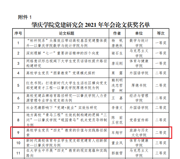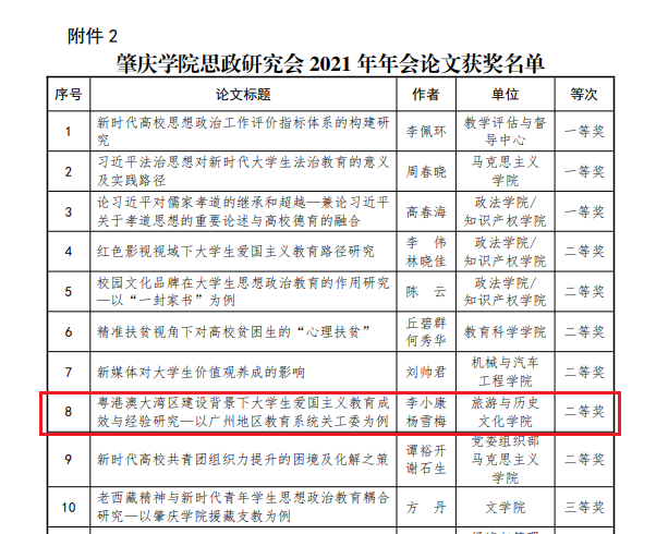 其中,TapTap点点官方网站车翔宇老师撰写的《高校学生党员“四史”教育的价值与实践路径探索》获得肇庆学院党建研究会2021年年会论文二等奖,杨雪梅书记、李小康老师撰写的《粤港澳大湾区建设背景下大学生爱国主义教育成效与经验研究—以广州地区教育系统关工委为例》获得肇庆学院思政研究会2021年年会论文二等奖。