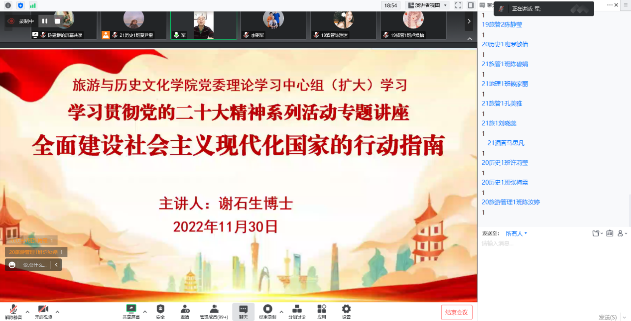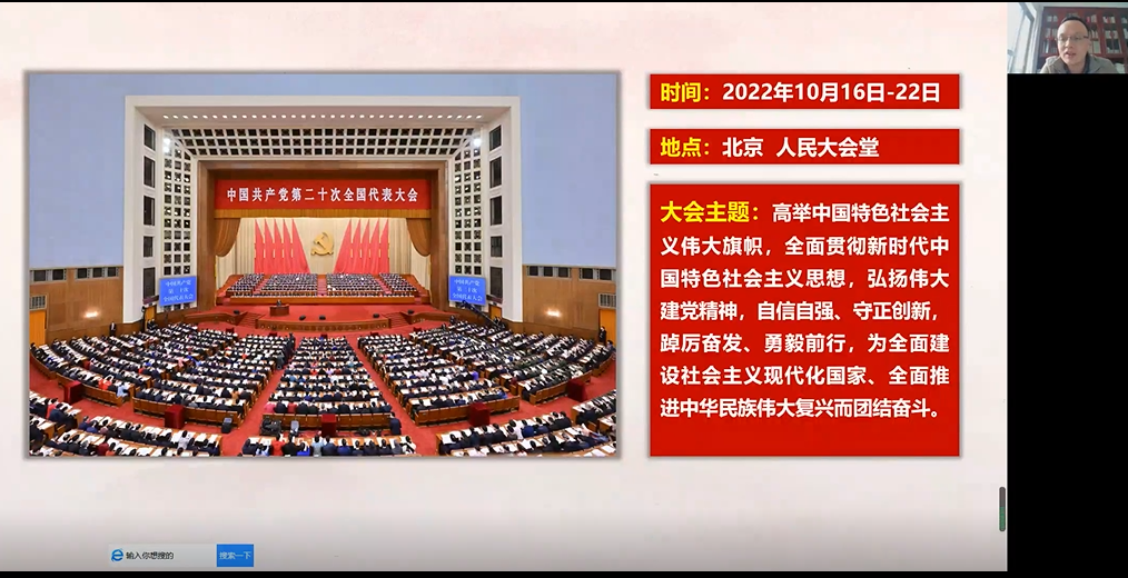 本次专题辅导邀请校宣讲团成员、马克思主义学院副教授谢石生博士,以《全面建设社会主义现代化国家的行动指南》为题,带领师生深刻领会党的二十大主题和“三个务必”的根本政治要求。他分别从五个方面阐述“全面建设社会主义现代化国家”这个主题:一是过去5年的工作和新时代10年的伟大变革;二是开辟马克思中国化时代化新境界;三是新时代新征程中国共产党的使命任务;四是全面建设社会主义现代化国家的谋划安排;五是以党的自我革命引领社会革命。谢石生表示,我们要深刻领会以上五个方面共同构成的中国特色社会主义事业“五位一体”总体布局,认真领悟党的二十大的主题意蕴、现实基础、理论指导、使命任务、战略部署;深刻领会教育科技人才、法治建设、国家安全方面的重大部署,深刻领会坚持党的全面领导和全面从严治党的重大部署,既要整体把握、全面系统,又要突出重点,抓住关键,把党的二十大精神落实到经济社会发展各方面,体现到做好今年各项工作、安排好今后工作当中。