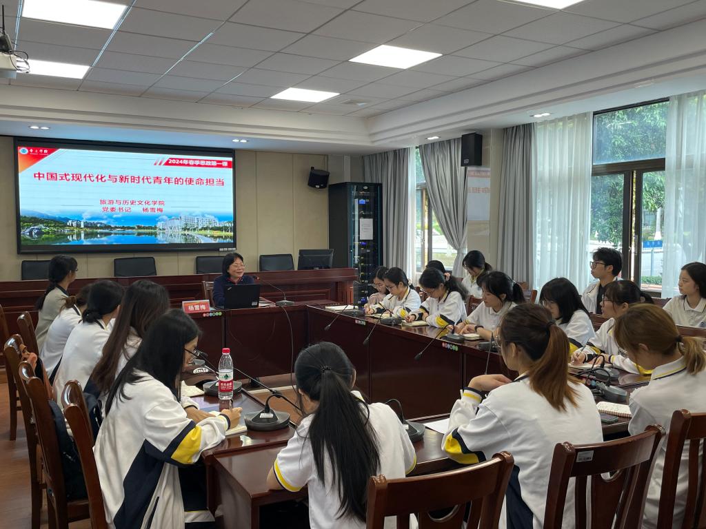 3月21日,旅游与历史文化学院2024年春季学期“思政第一课”在学院大会议室进行。专职组织员陈建群老师主持,2022级各班40多名入党积极分子、青马班学员、学生代表参加了本次培训。