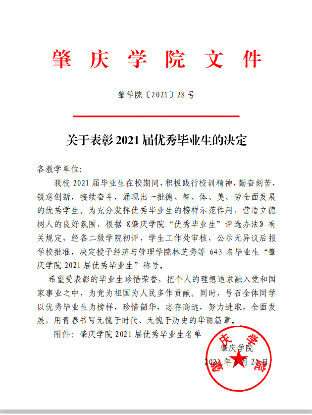 近日,学校公布了《关于表彰2021届优秀毕业生的决定》(肇学院2021年28号),TapTap点点官方网站方秋萍等36名学子荣获“肇庆学院2021届优秀毕业生”称号。具体名单如下: